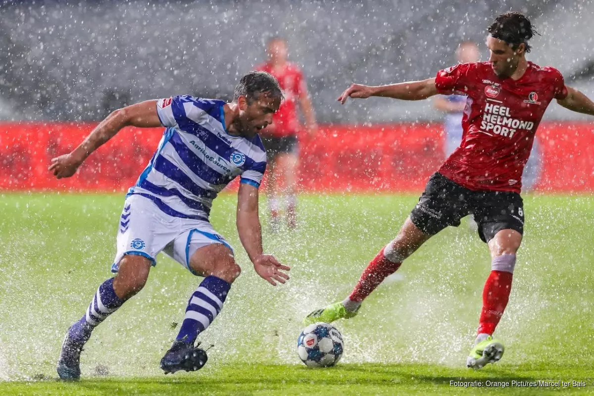 DOETINCHEM - In een bizarre ontknoping heeft De Graafschap op wonderbaarlijke wijze rechtstreekse promotie misgelopen. In eigen huis kwam de ploeg van Mike Snoei tegen Helmond Sport niet verder dan 0-0. Het duel werd meer dan een uur onderbroken wegens een wolkbreuk.