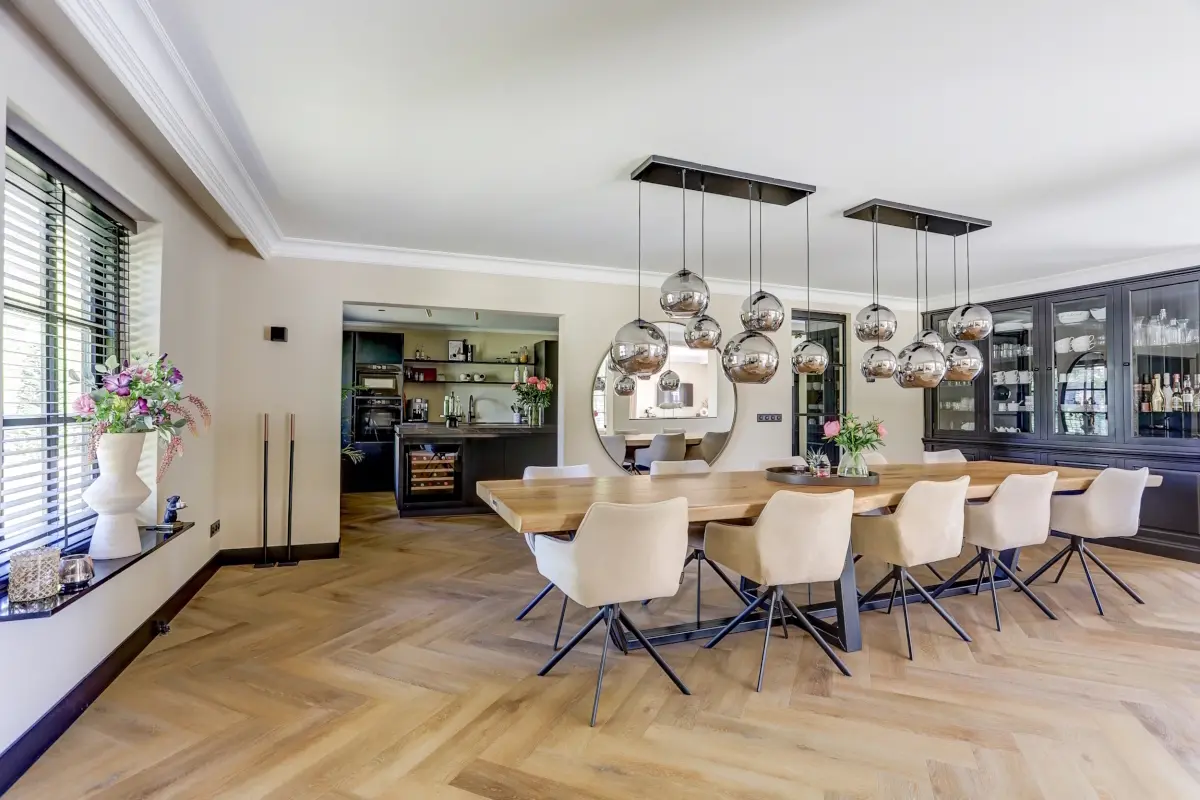 De eetkamer, direct grenzend aan de woonkamer, is een droom voor elke gastvrouw of -heer. Stel u eens voor: een lange, feestelijk gedekte tafel onder een cluster van designlampen, met uitzicht op de stijlvolle maatwerkkastenwand. Een ruimte waar etentjes vanzelf uitlopen tot diep in de avond.